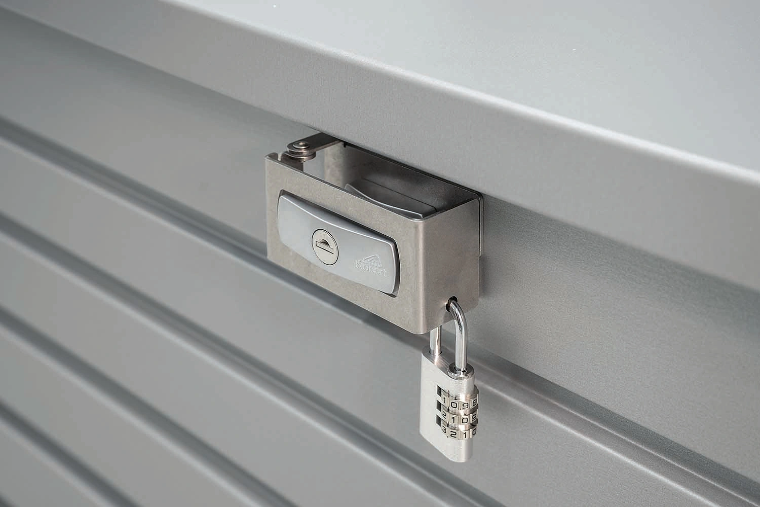 Rustfri låsestang og hængelås med nummerkombination og sikringskabel i rustfrit stål.