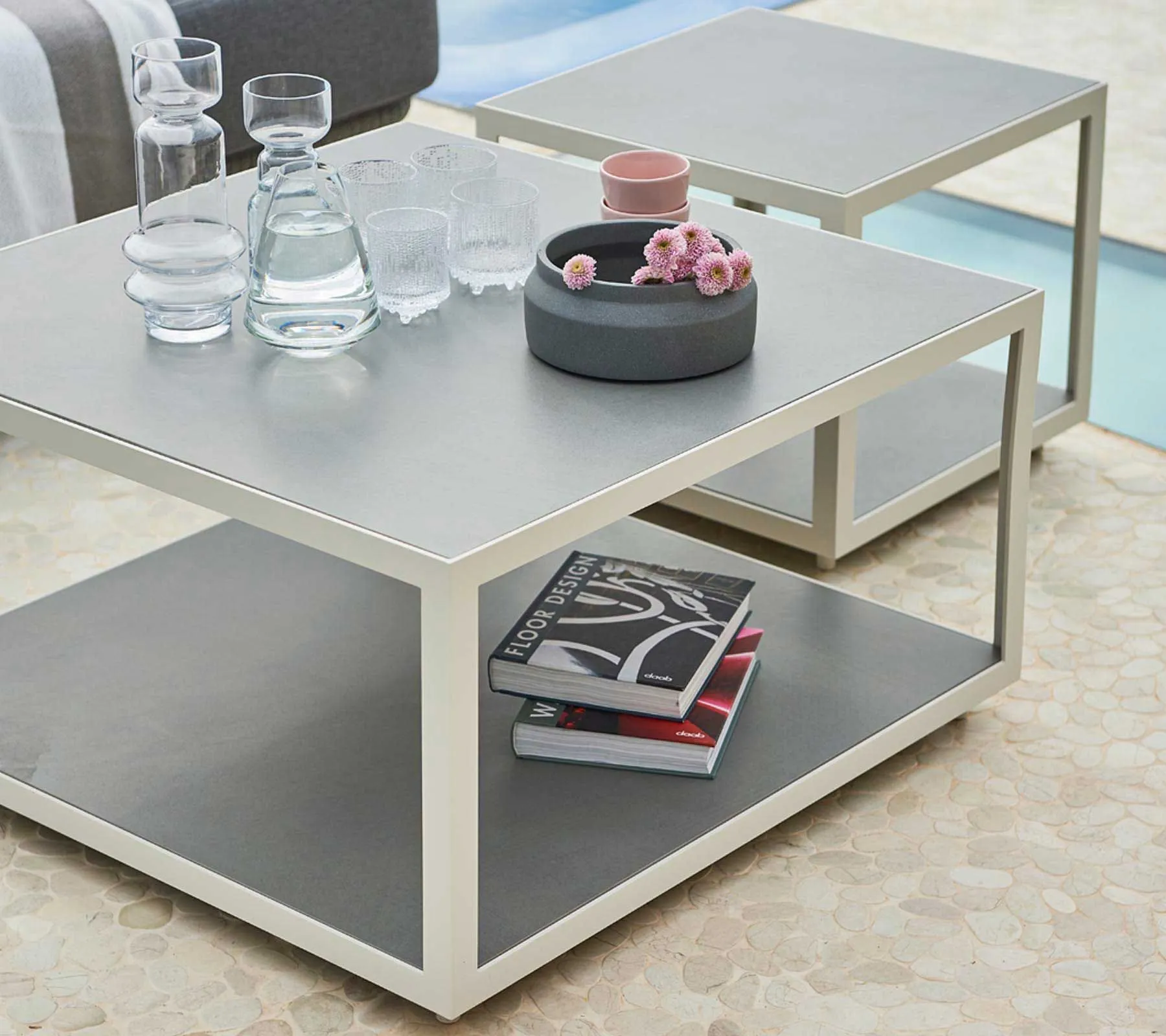 da:,pl:Bordpladesæt til Cane-Line sofabord. Bordpladerne er i lysegrå keramik.