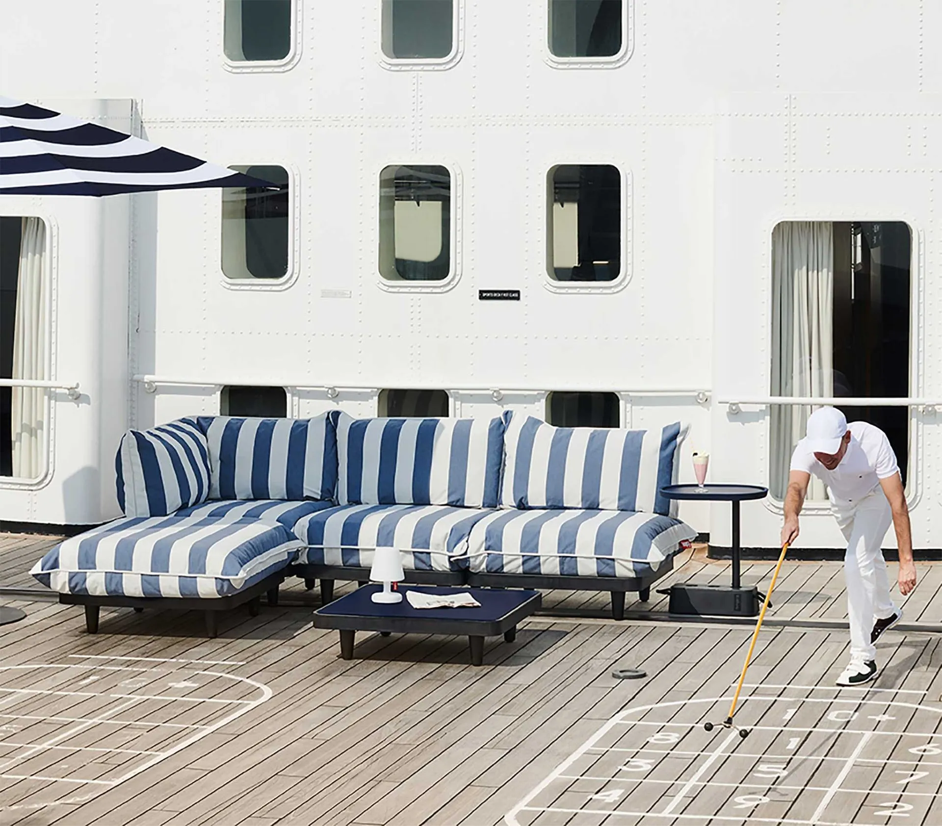 Puderne er UV-bestandige og vandtætte dækket med slidstærkt Sunbrella-tekstil, og det rustfrie ryglæn har førsteklasses pulvercoating.