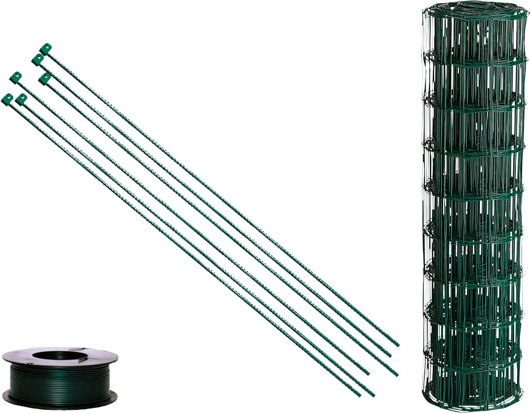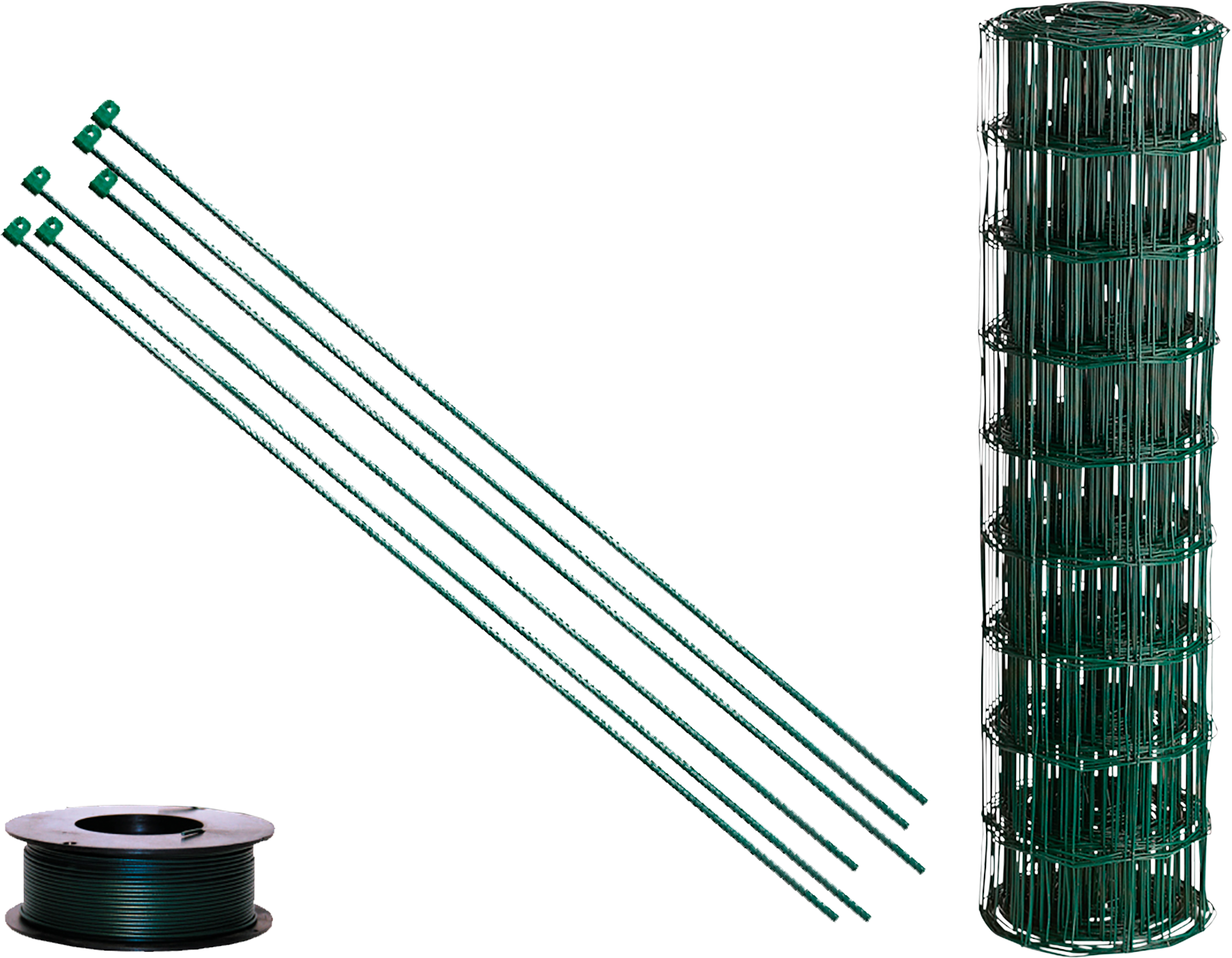 Hegnet består af 25 meter plastbelagt trådhavehegn i grøn og har en maskestørrelse på 10×10 cm og en højde på 90 cm. Der medfølger 10 stk. grønlakerede tentorstålpæle i Ø10×1450 mm og 60 meter bindetråd. Pælene sættes med en afstand på ca. 3 meter og monteres på hegnet med den medfølgende bindetråd.
