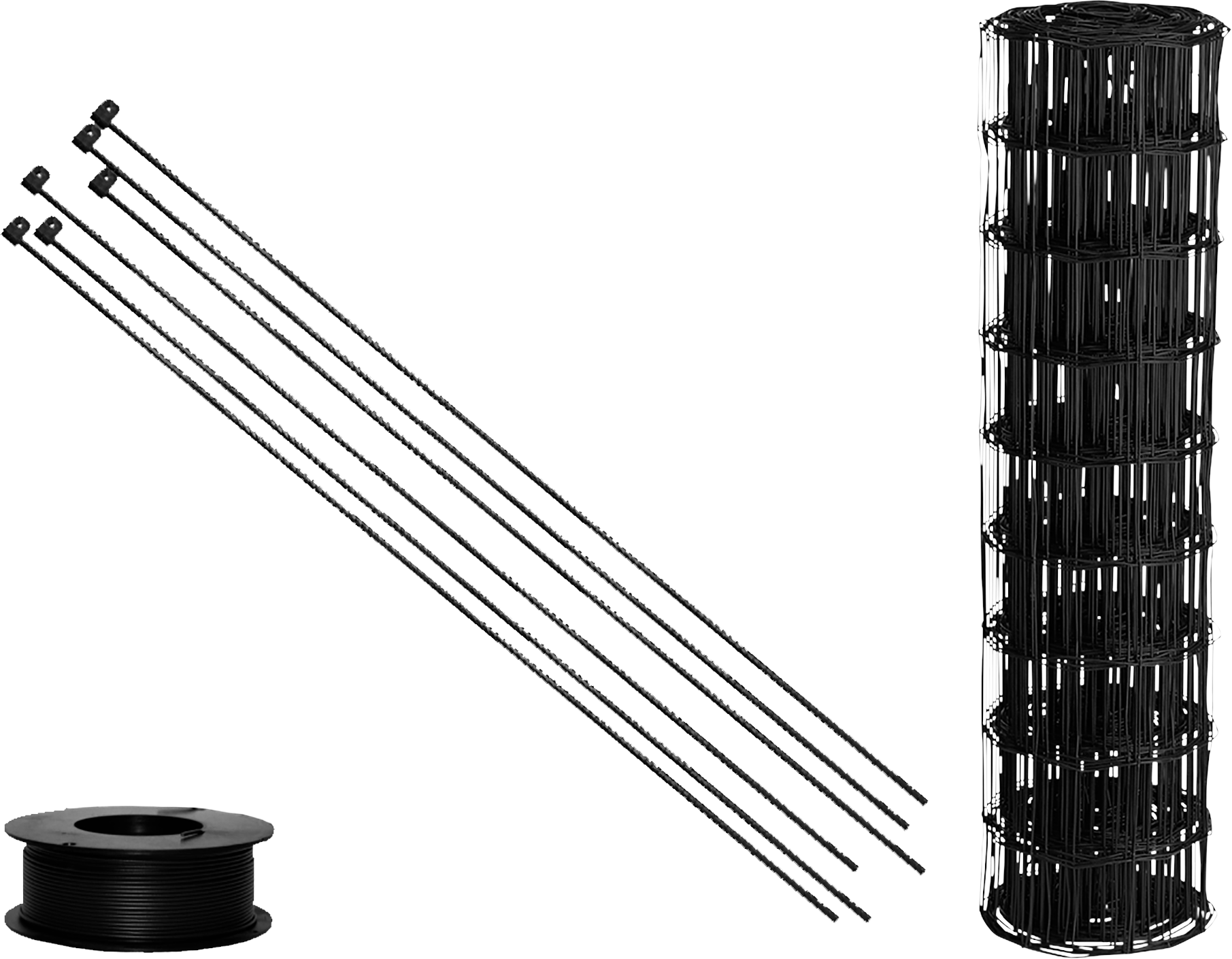 Sættet består af 25 meter plastbelagt trådhavehegn i sort med en maskestørrelse på 10×10 cm og en højde på 90 cm. Sættet indeholder10 stk. sortlakerede tentorstålpæle i Ø10×1450 mm og 60 meter bindetråd. Pælene sættes med en afstand på ca. 3 meter og monteres på hegnet med den medfølgende bindetråd.