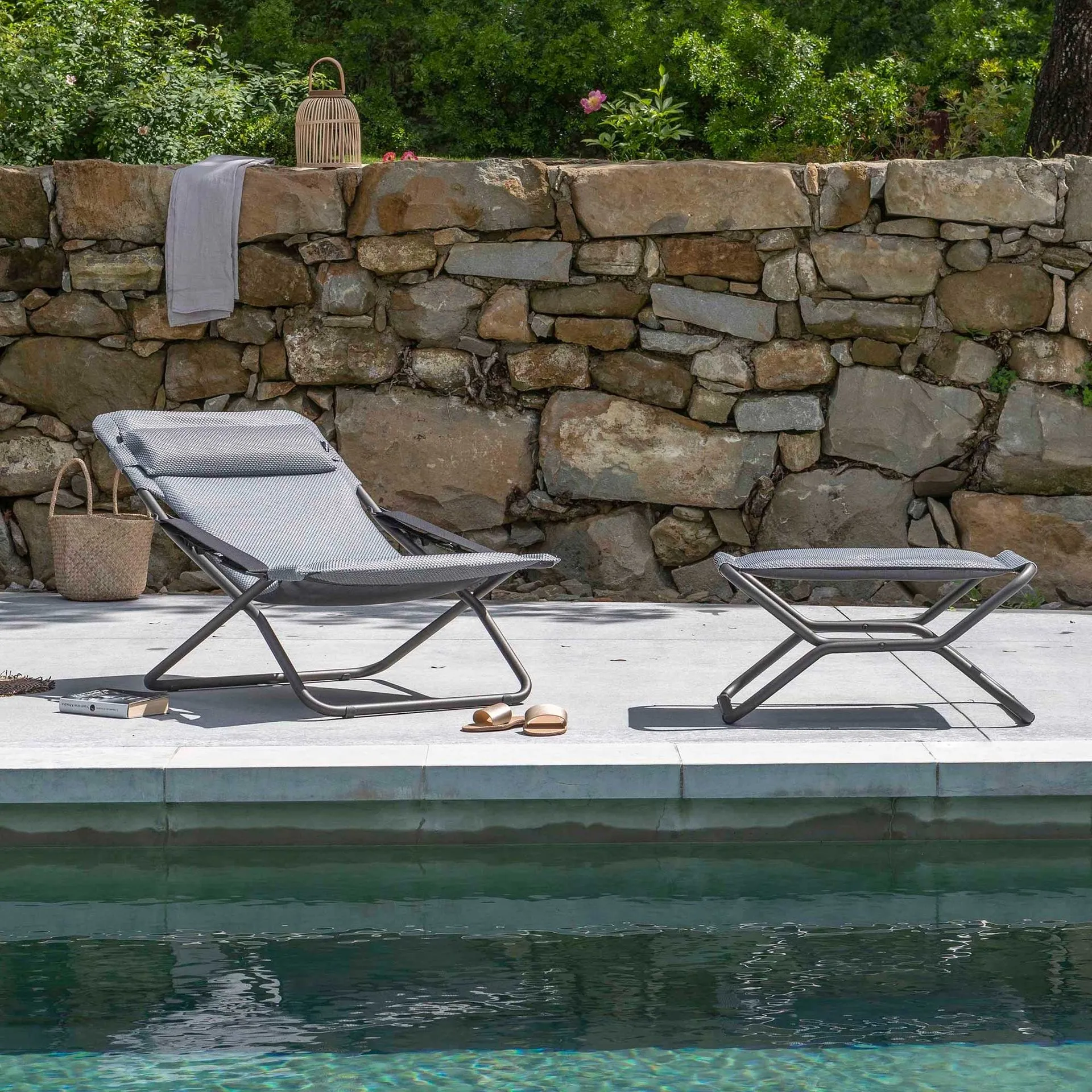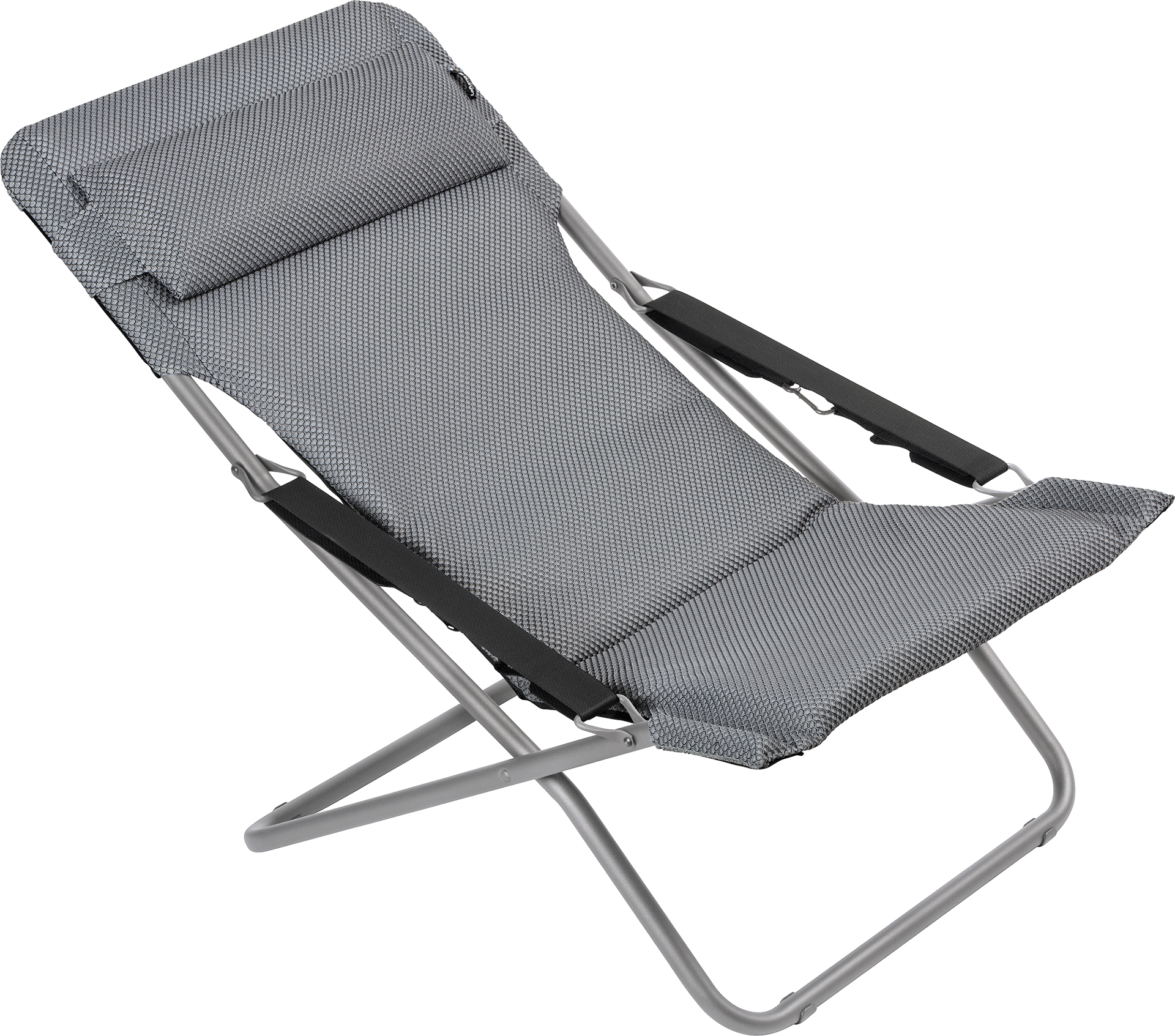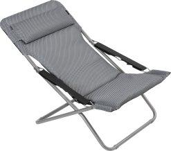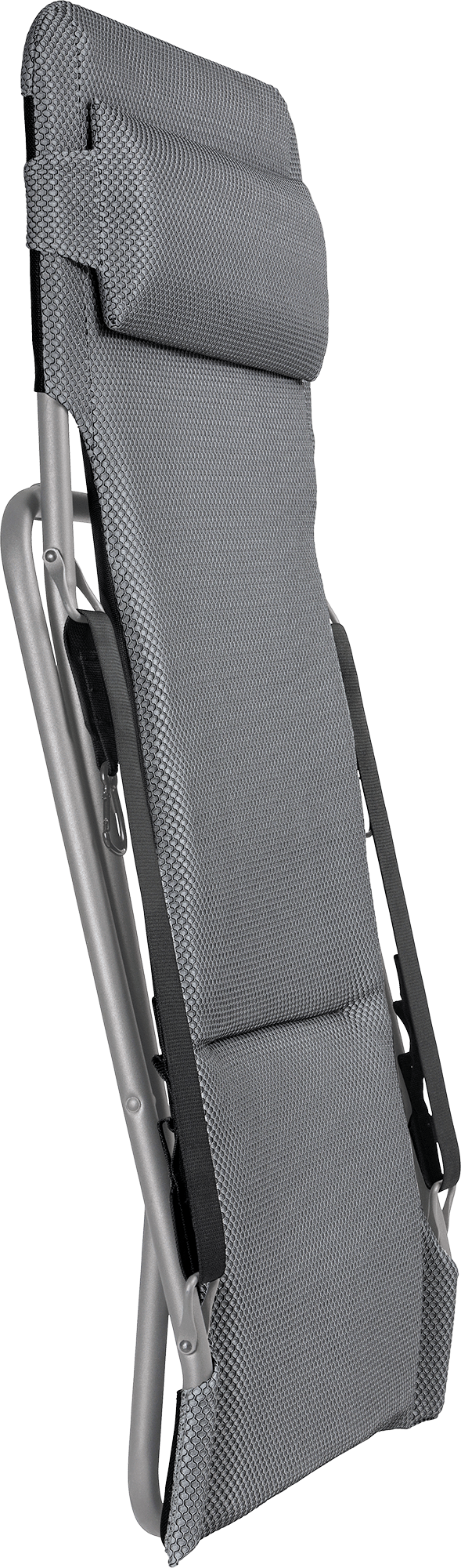 Lækker liggestol med stor siddeflade. Liggestolen har forstærket vævet armlæn med indstilling i 3 positioner ved hjælp af en praktisk karabinhage (inklusiv vandret position). Med en regulerbar og aftagelig nakkepude, så du kan tilpasse efter behov.