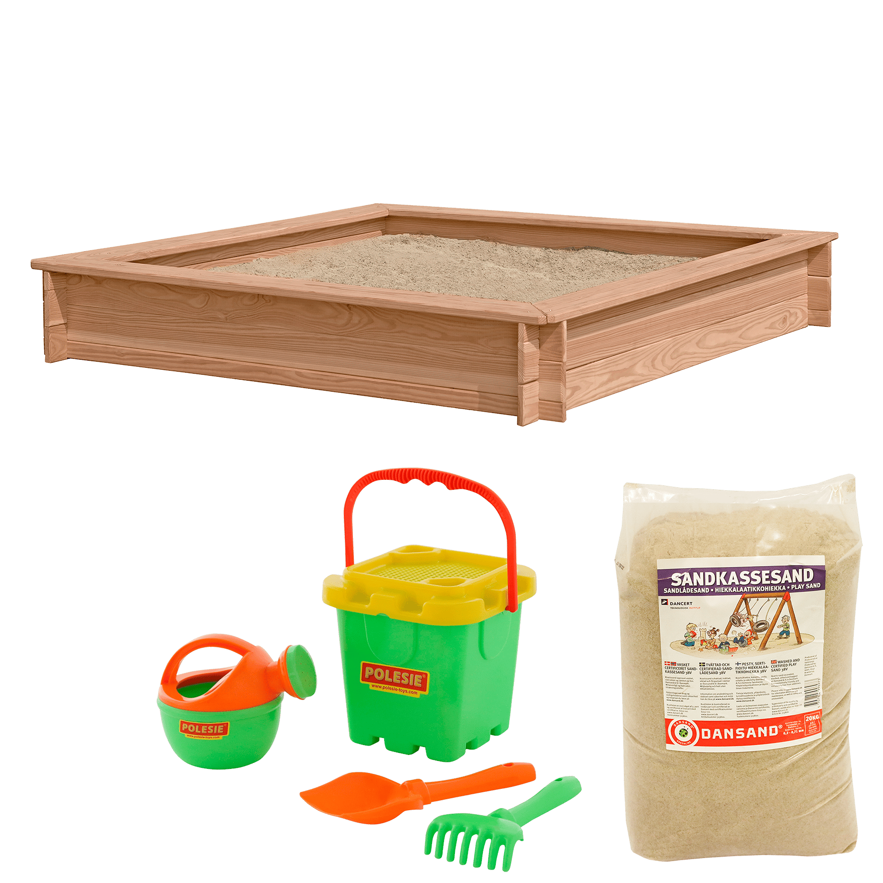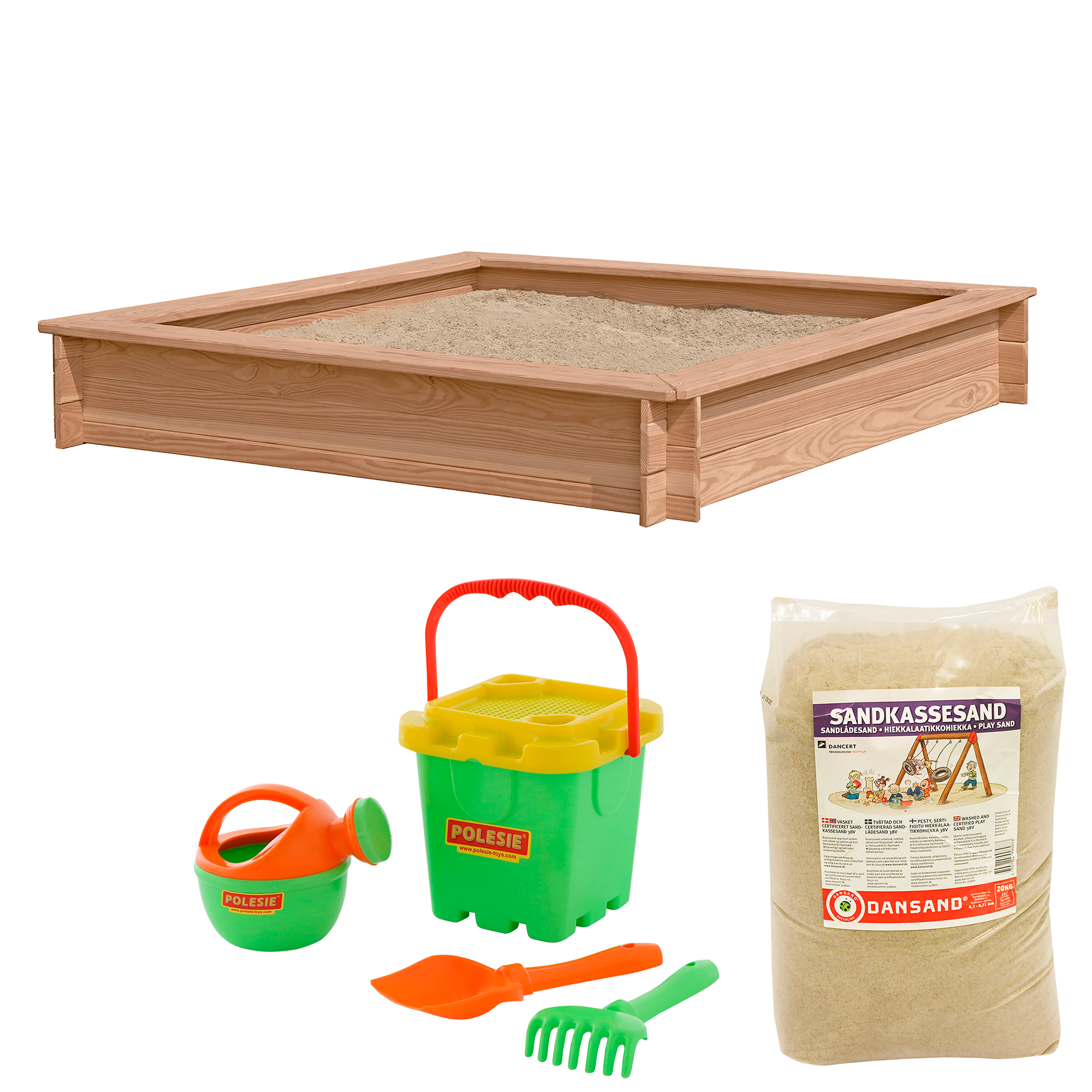 NORDIC PLAY sandkasse i lærketræ inkl. 240 kg sandkassesand og sandkasselegetøj med grøn spand/si med skovl, vandkande og rive Sandkassen måler 150 x 150 x 25 cm. Let udførlig samlevejledning medfølger, samt skruer. Når hele familien vil samles til hygge og leg, er muligheden her rigtig god. Sandkassen er populær blandt alle børn og giver mange timers sjov og kreativ leg i haven. Mål: Længde 150 cm Bredde 150 cm Højde 25 cm Kvartssand opgravet vasket, siet/siktet og sækket op hos Dansand A/S i Danmark. Miljøvenligt og helt uden tilsætningsstoffer. Så kan du med god samvitighed lade dine børn gå i sandkassen. Leveres i sække af 20 kg. Inkl. legetøj til sandkassen.
