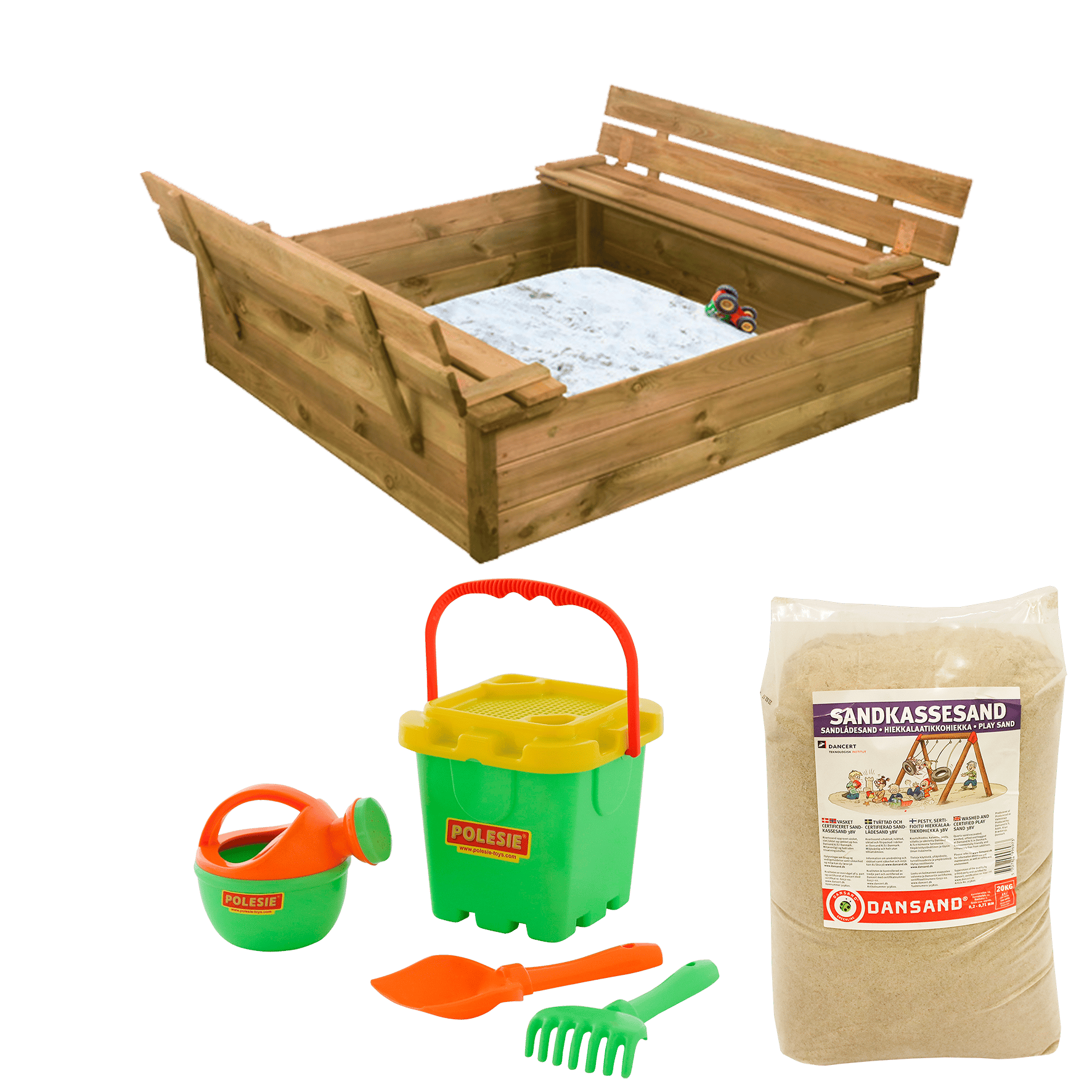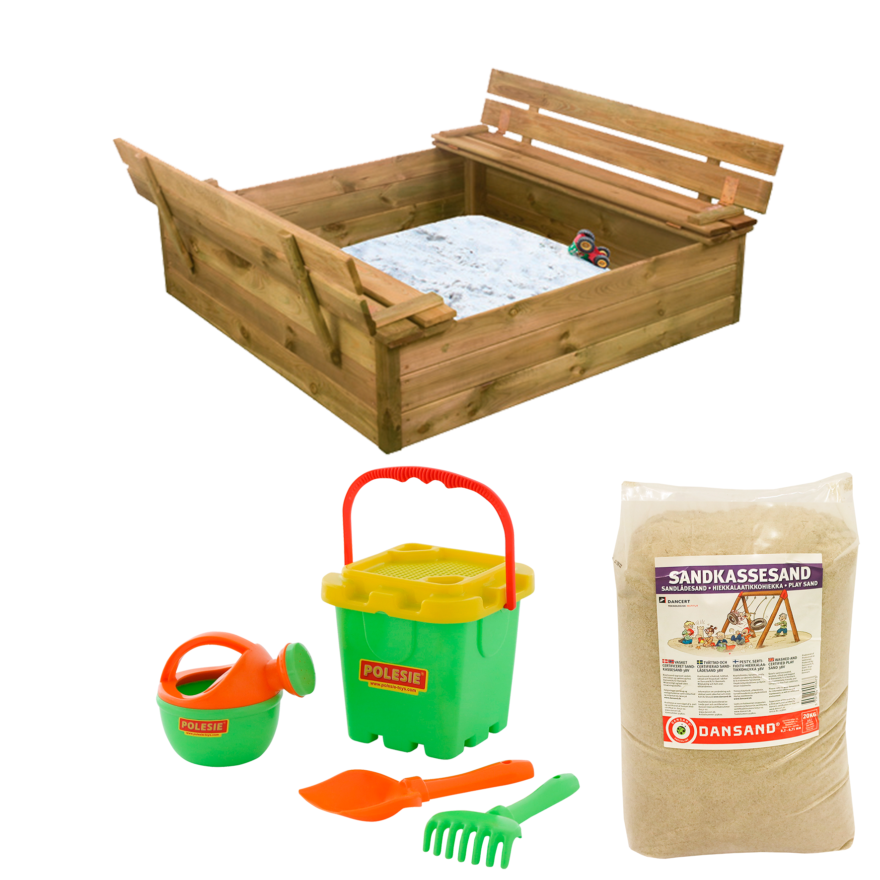 NORDIC PLAY sandkasse 120×120 cm inkl. bænk og 240 kg sandkassesand samt sandkasselegetøj med grøn spand/si med skovl, vandkande og rive. Sandkassen er populær blandt alle børn og giver mange timers sjov og kreativ leg i haven. Fremstillet i trykimprægneret fyrretræ og med integreret bænk, som fungerer som låg, når den ligges ned. Sandkassen er trykimprægneret uden chrome og arsen for længere levetid. Mål: Længde 120 cm Bredde 120 cm Højde 29 cm Inkl. 240 kg certificeret sand – efter samling er produktet klar til brug. Udført i trykimprægneret fyrretræ, i størrelsen 120 x 120 x 24 cm. Let udførlig samlevejledning medfølger, samt skruer. Inkl. 240 kg kvartssand opgravet vasket, siet/siktet og sækket op hos dansand a/s i Danmark. Helt uden tilsætningsstoffer. Så kan du med god samvitighed lade dine børn gå i sandkassen. Leveres i 12 sække af 20 kg.