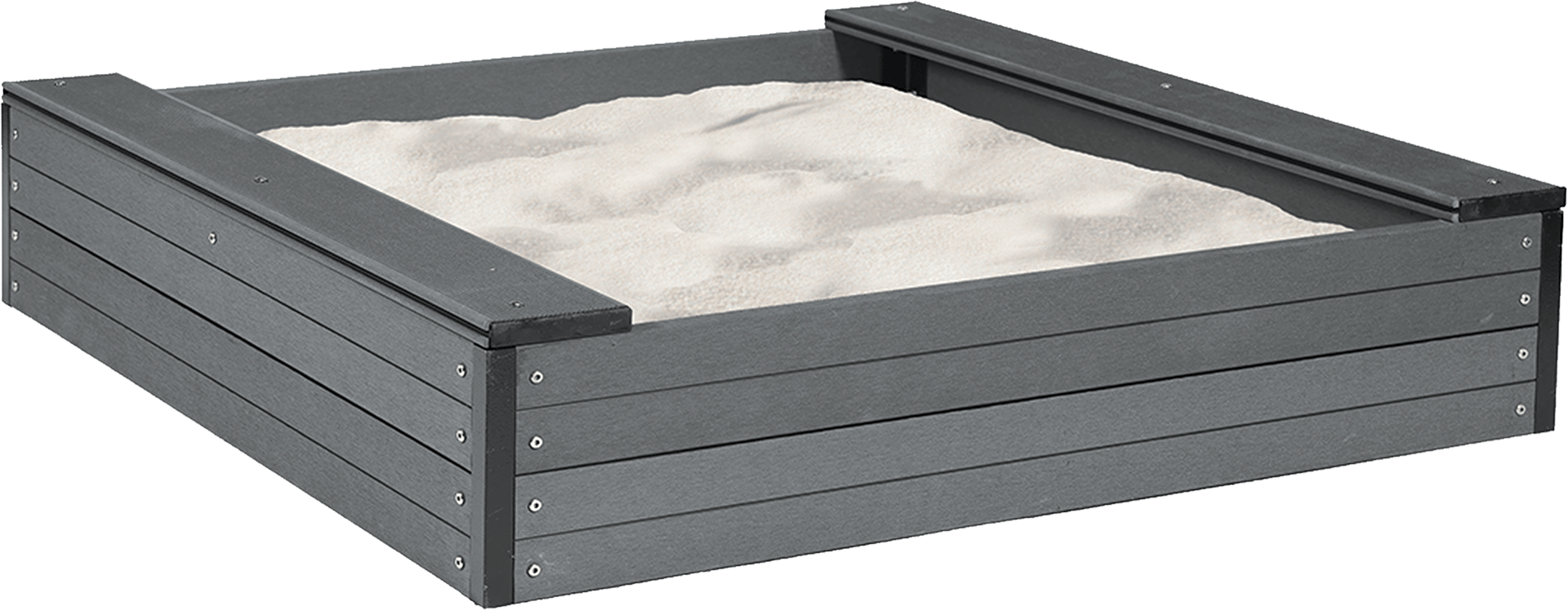 Sandkasse fremstillet i vedligeholdelsesfrit komposit med siddebrædder i hver side. Leveres usamlet med udførlig samlevejledning samt skruer.