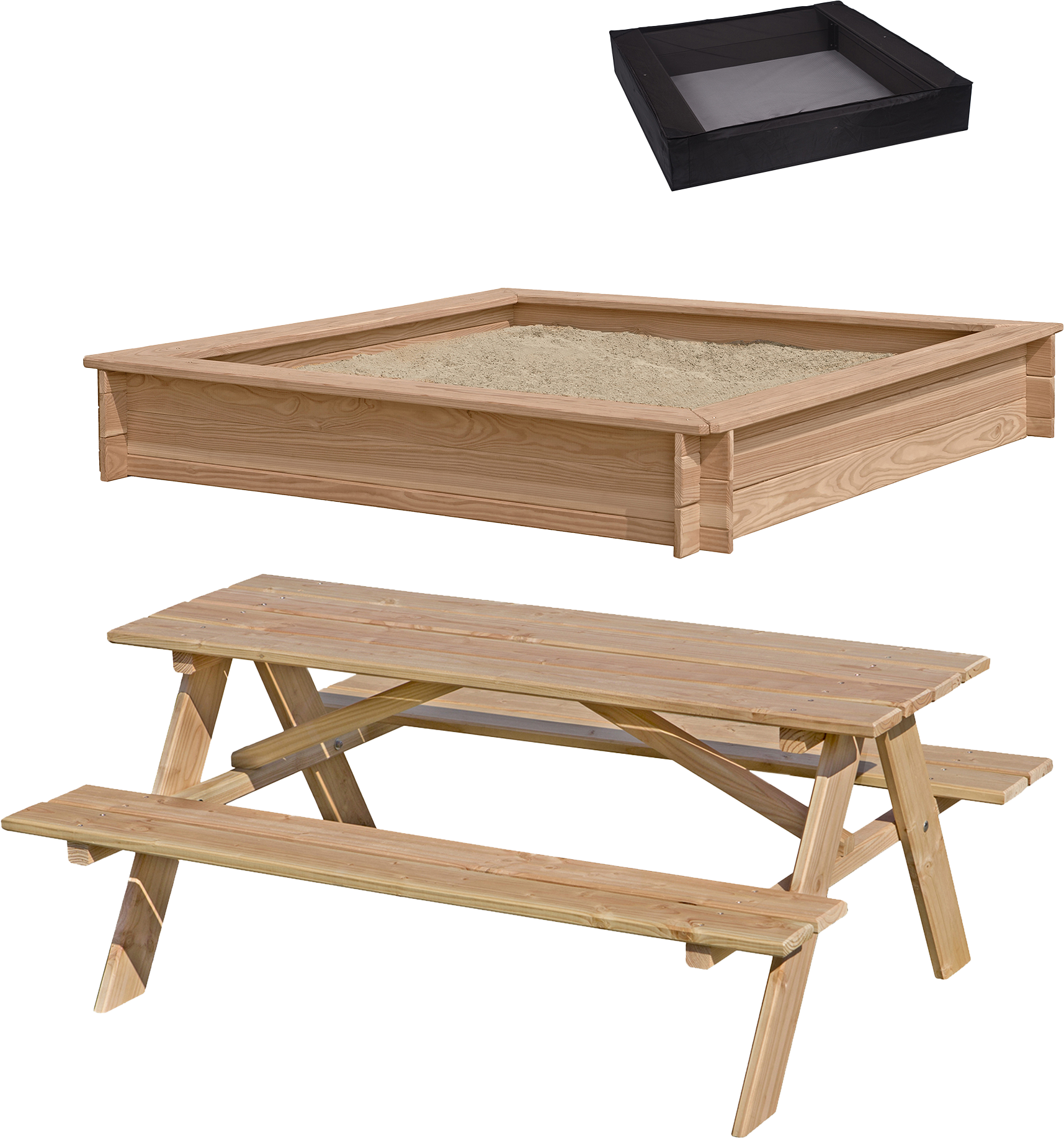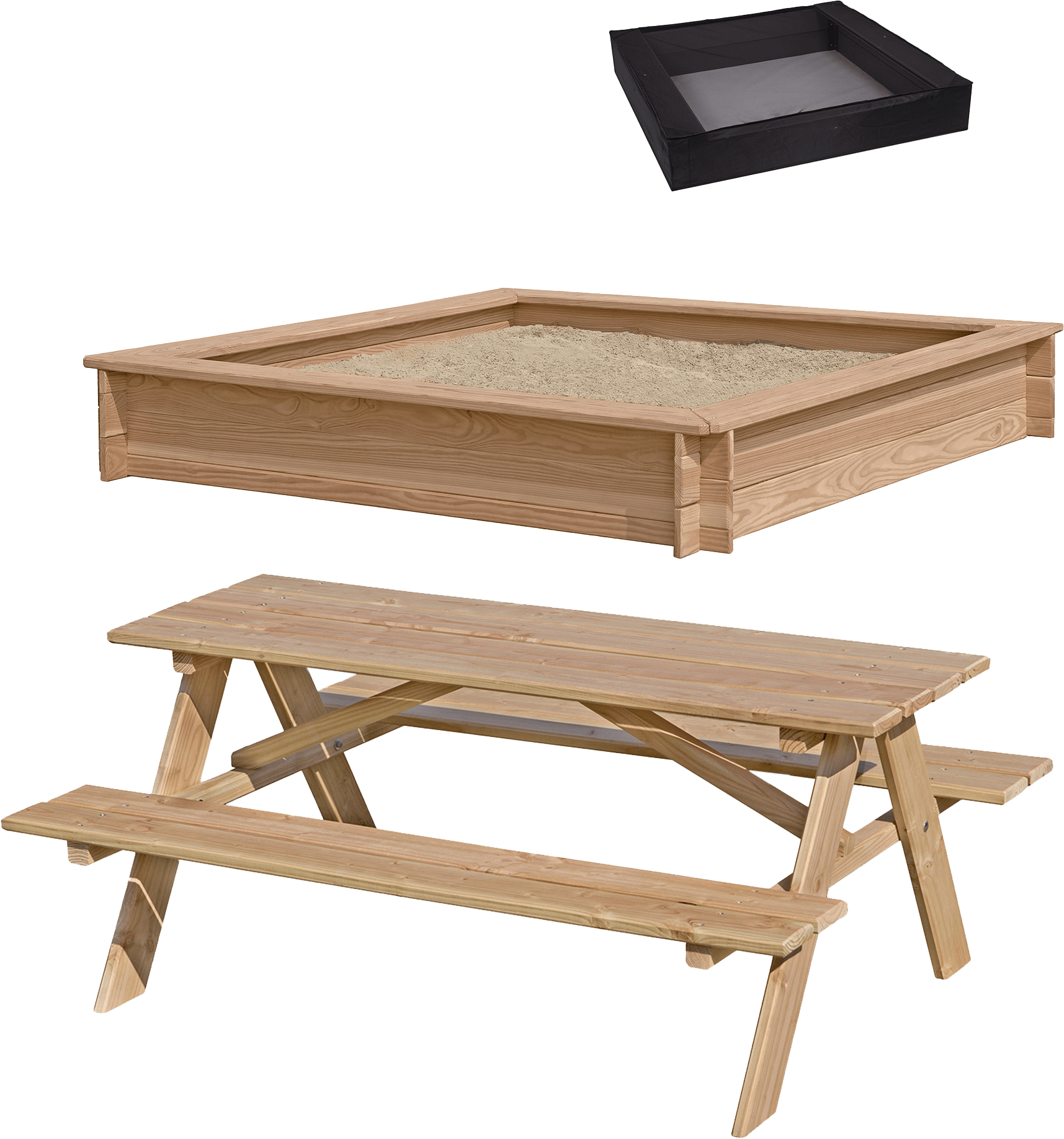 Sampak bestående af børne bordbænkesæt i lærketræ og sandkasse 150×150 cm ligeledes i lærketræ. Inkl sandkassenet.