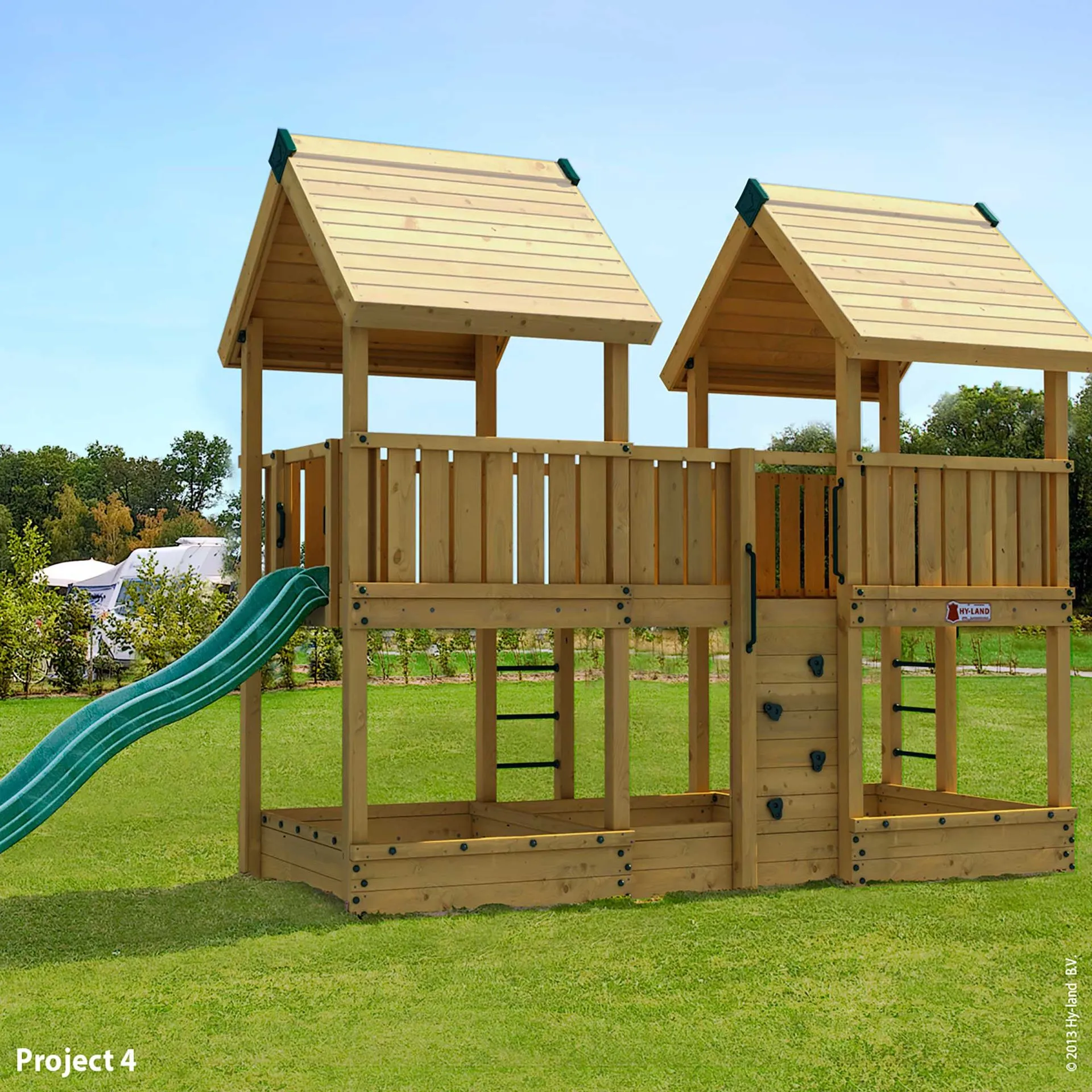 Hy-Land Projekt 4 består af 1 tårn med klatrevæg, 2 tårne med tag, sandkasse og stige samt 1 rutschebane. Max. antal brugere på samme tid: 6 børn Legepladsens sikkerhedsareal: 47 m2 Dimensioner: B: 6,8 meter x D: 1,9 meter Dimensioner inkl. sikkerhedsareal: B: 10,2 meter x D: 4,6 meter Derudover indeholder det: – Opsætningsvejledning – Logbog – Møtrikbeskyttere – Pulverlakerede håndgreb – Skridsikre klatresten – Monteringsbeslag til taget – Skridsikre pulverlakerede stigetrin – Beslag til fastgørelse af fundament – Beslag og tilhørende værktøj – Sandkasse bund/sandkasse net – Vaterpas – ID skilt i aluminium – Bor samt afstandsværktøj – Monteringsbeslag til rutschebanen Kvalitet: De kraftige Hy-Land komponenter og tilbehør opfylder de højeste standarder og testes regelmæssigt for styrke og holdbarhed. Vejrbestandige og galvaniserede. Hy-Land legepladsprojekter kræver minimum vedligeholdelse og er let at opsætte. Træet er NTR-A trykimprægneret fyrretræ, som garanterer lang holdbarhed, og leveres i afskårne dimensioner klar til at samle. Sikkerhed: Hy-land legepladser er omhyggeligt konstrueret med det formål at sikre optimal sikkerhed. Alle Hy-land legepladsprojekterne er typegodkendt af TÜV Rheinland, Tyskland i henhold til den europæiske standard EN 1176 – til brug på offentlige legepladser. Til at administrere det krævede periodiske eftersyn og vedligeholdelse er logbøger forudsat. Alle legepladser skal opsættes over et stødabsorberende underlag i overenstemmelse med europæisk standard EN 1177. Anvendelse: Hy-land er specielt velegnet til: – Restauranter – Hoteller – Mindre Skoler – Mindre daginstitutioner – Mindre campingpladser – Grundejerforeninger Uanset antallet af børn og det tilgængelige område, kan du finde en egnet Hy-land legeplads blandt de forskellige projekter i sortimentet. Alle projekter leveres med den kraftige grønne Hy-slide (TM) rutschebane inkl. forankringsbeslag.