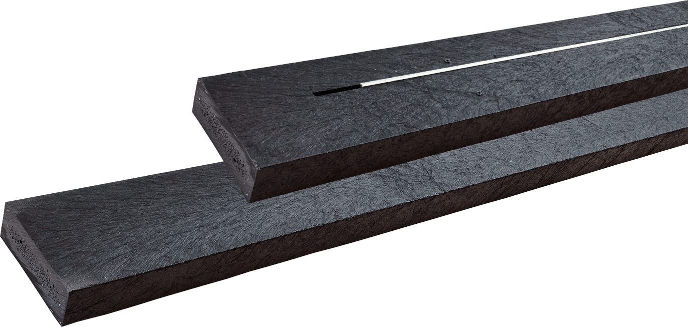 Ensartet overflade og struktur. Skarpkantede massive planker forstærket med stålprofil. Vedligeholdelsesfri, gennemfarvet og UV-stabiliseret.