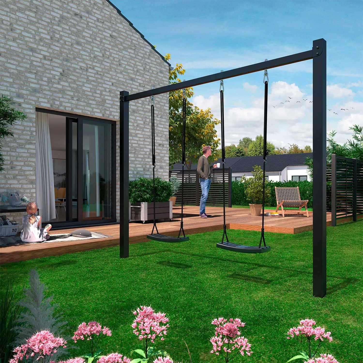 Gyngestativ i stål inkl. 2 sorte gyngesæder – Pulverlakeret sort