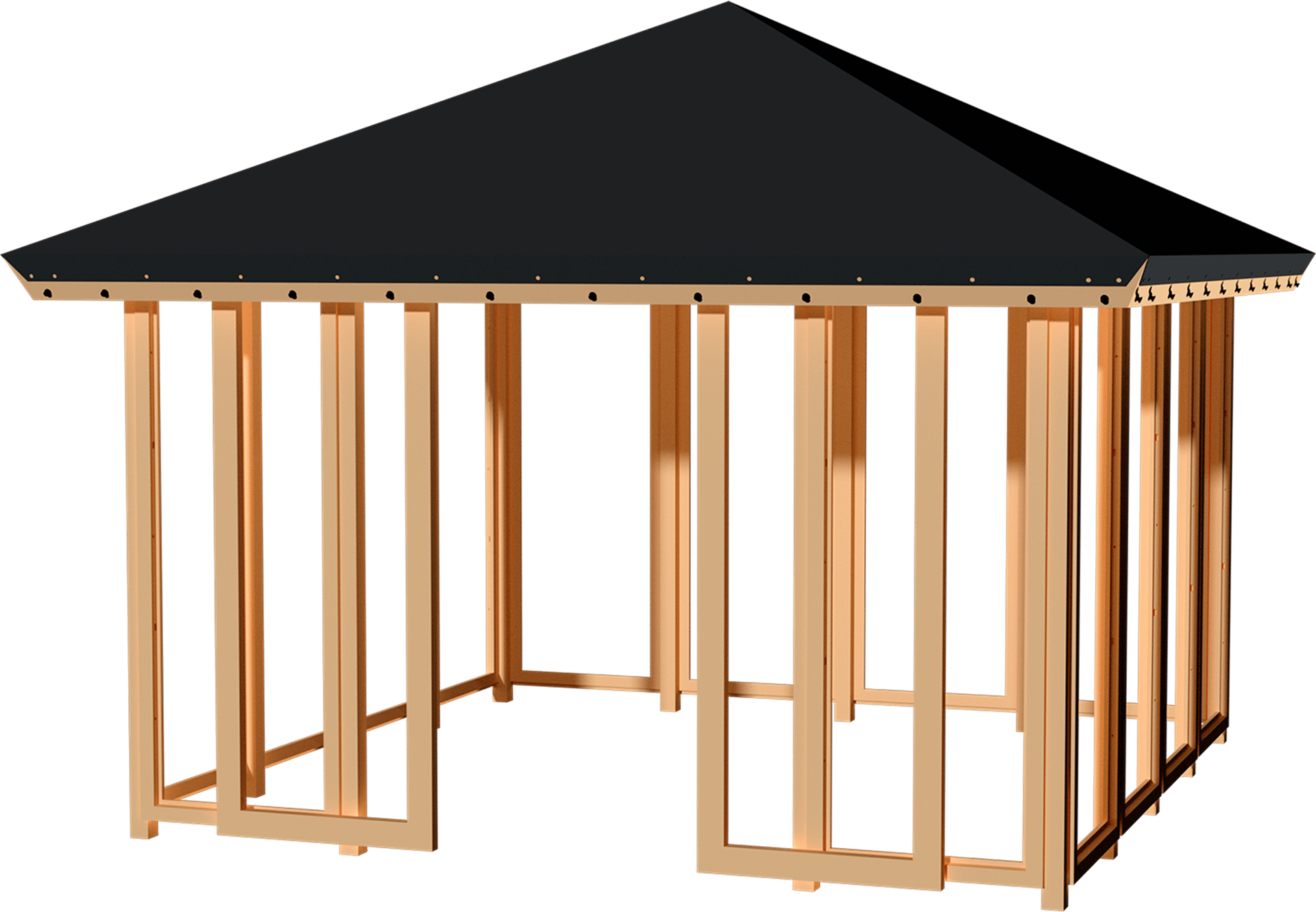 Denne model består af grundsæt og pavillonelementer til at lukke 4 sider, og skydedør samt ekstra stolper. Modellen leveres med sort tagdug