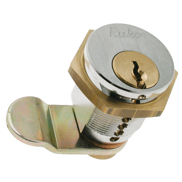 6-stiftet lås fra Ruko til garderobeskabe, postkasser, værktøjsskabe og lign., der er udført af stålplade.