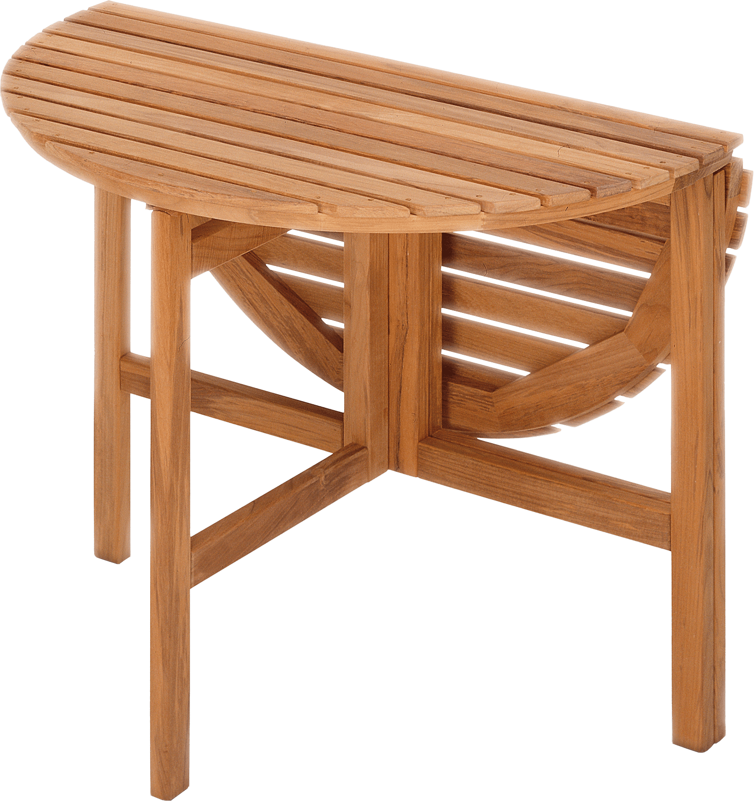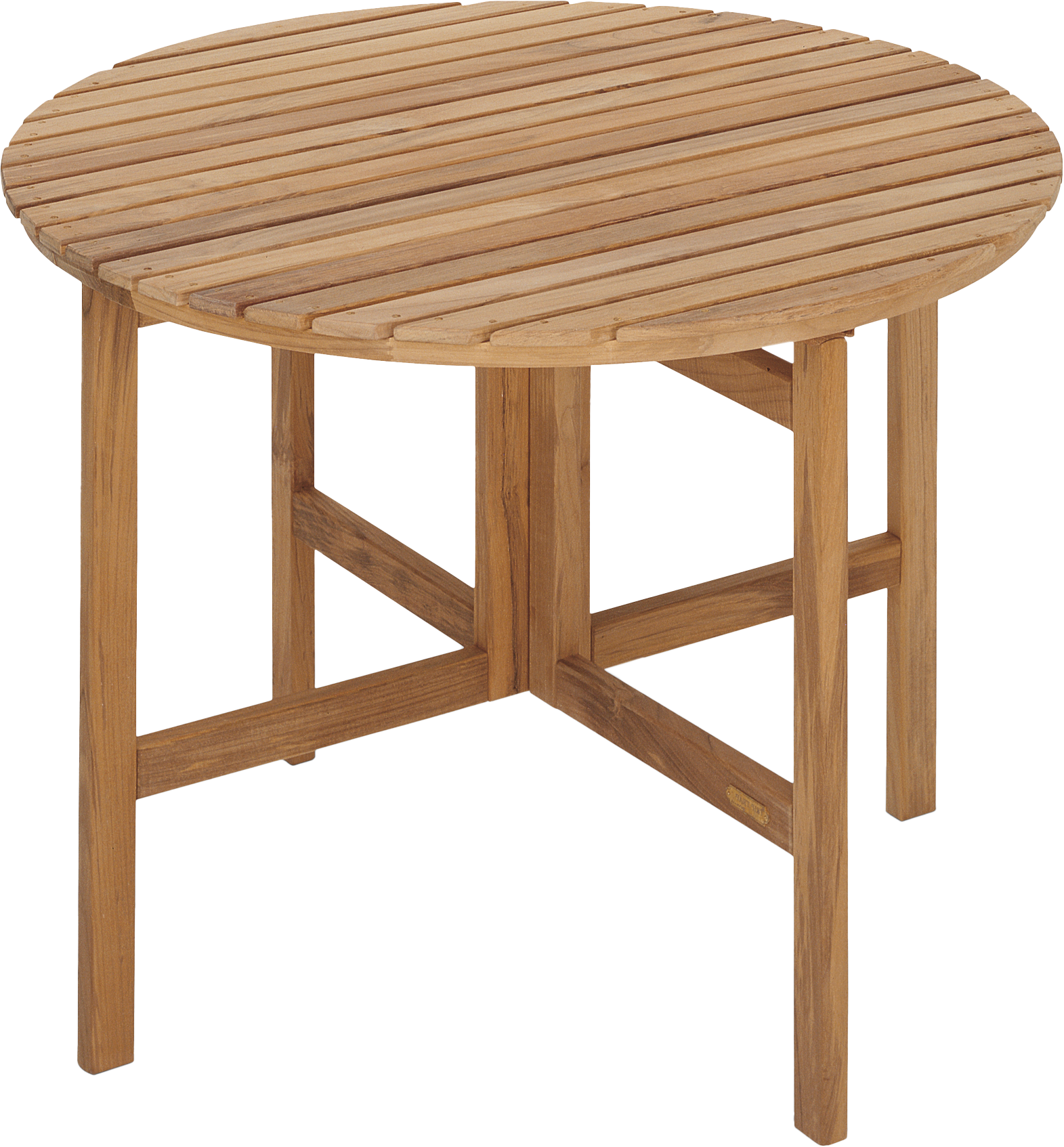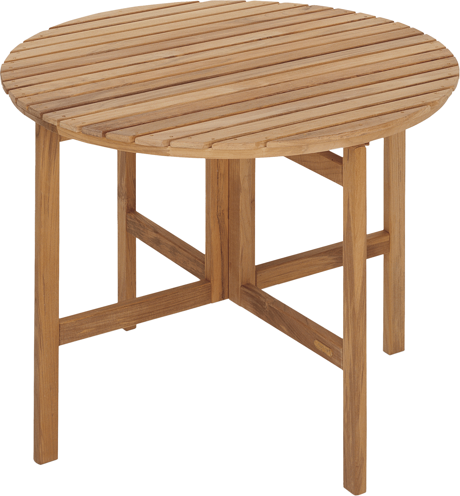 Rundt bord i teak, som kan nemt kan foldes sammen, så det ikke fylder så meget, når det skal opbevares om vinteren.