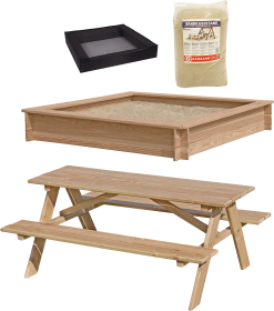 Nordic Play SANDKASSE OG BORDBÆNKSÆT TIL BØRN INKL NET OG 200KG SAND