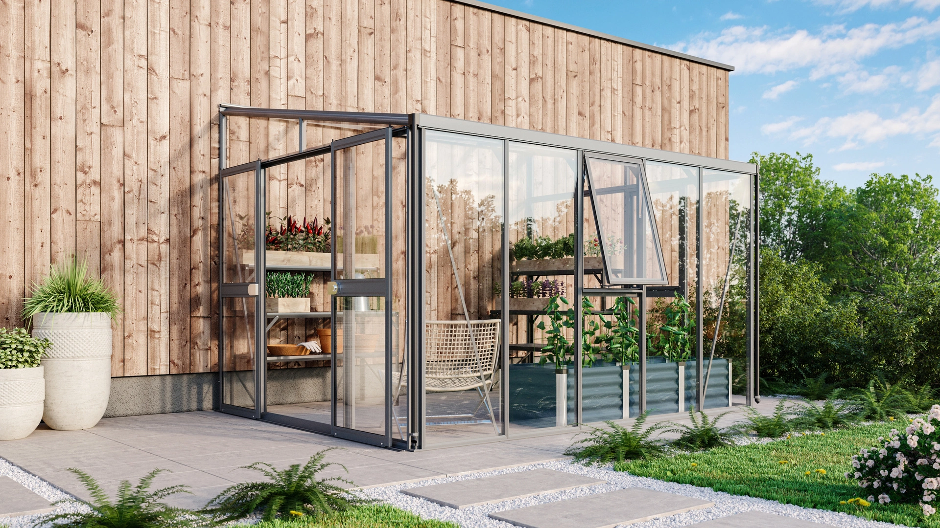 Et drivhus fra Helena-serien er skabt til dig, der er på udkig efter et flot og elegant vægdrivhus, der kan anvendes som både væksthus og havestue. Helena leveres med 10 mm polycarbonatplader i taget. Resten af drivhuset består af 3 mm hærdet glas i hele baner. Alle modeller leveres desuden med nedløbsrør og to sidevinduer. Den indbyggede meget kraftige bundramme kan monteres direkte oven på en plan overflade eller oven på et støbt fundament uden brug af sokkel.