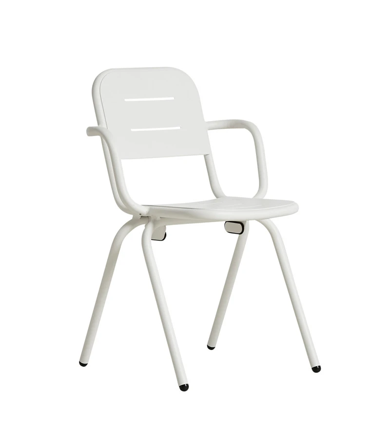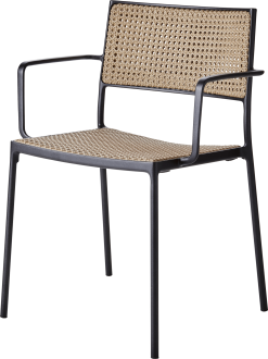 WOUD RAY er en moderne cafestol med armlæn, designet af Rolff og Fasting. Den er designet til udendørsbrug med den matte og resistente pulverlakering, og kan med sin lette aluminiumsramme nemt flyttes rundt. Det bløde design og de stribede mellemrum kaster smukke mønstre på jorden af solens stråler.